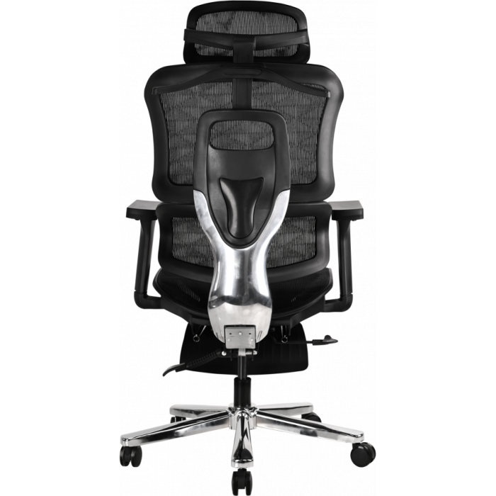 Спинка кресла состоит из двух частей и регулируется в диапазоне 90°-135°, что позволяет выбрать оптимальный угол наклона для работы или короткого отдыха. Регулировка высоты спинки позволяет адаптировать опору под рост пользователя, поддерживая правильную осанку и снижая нагрузку на позвоночник.
