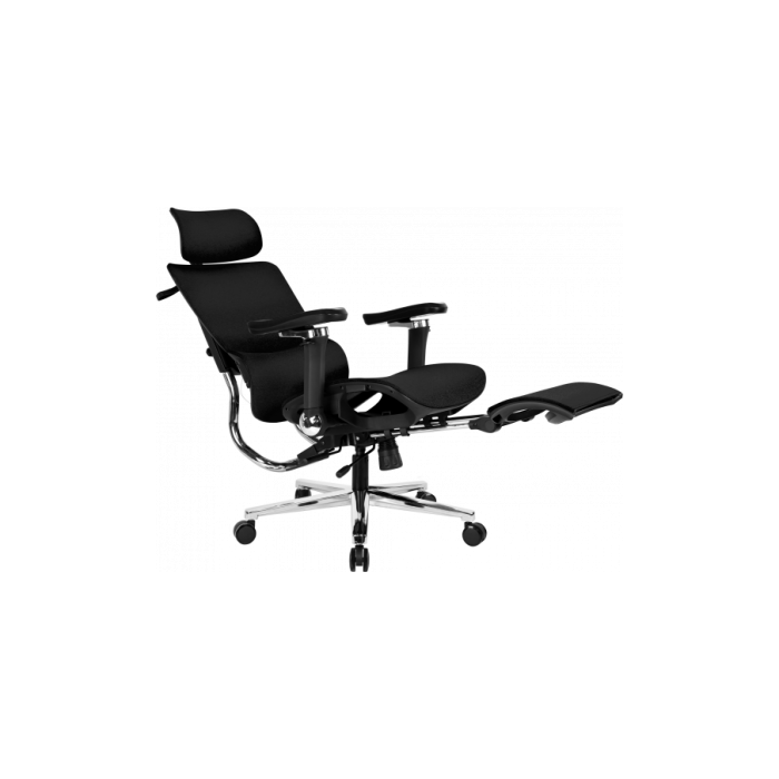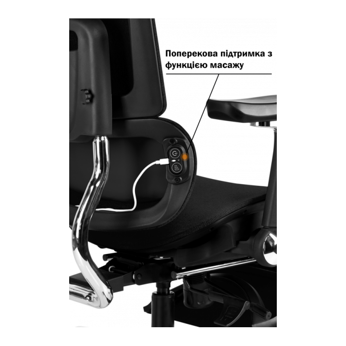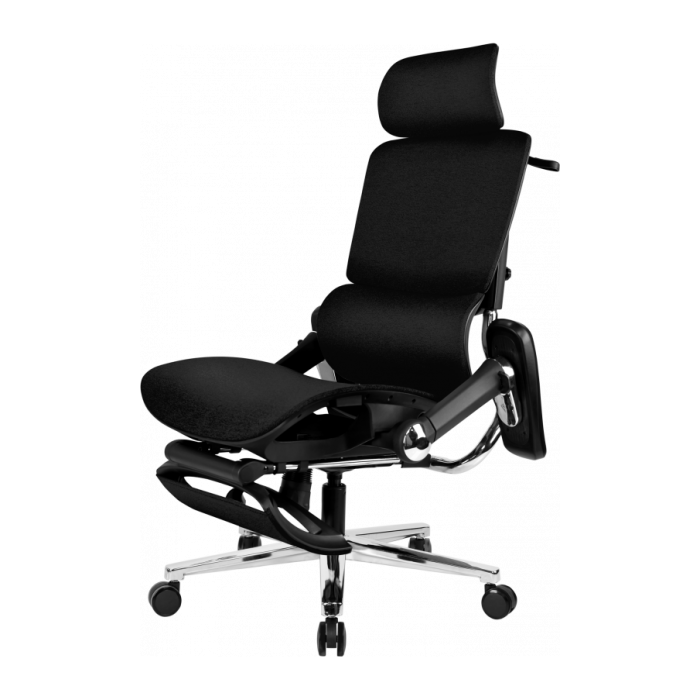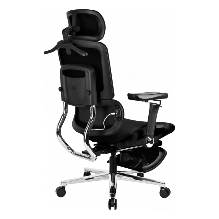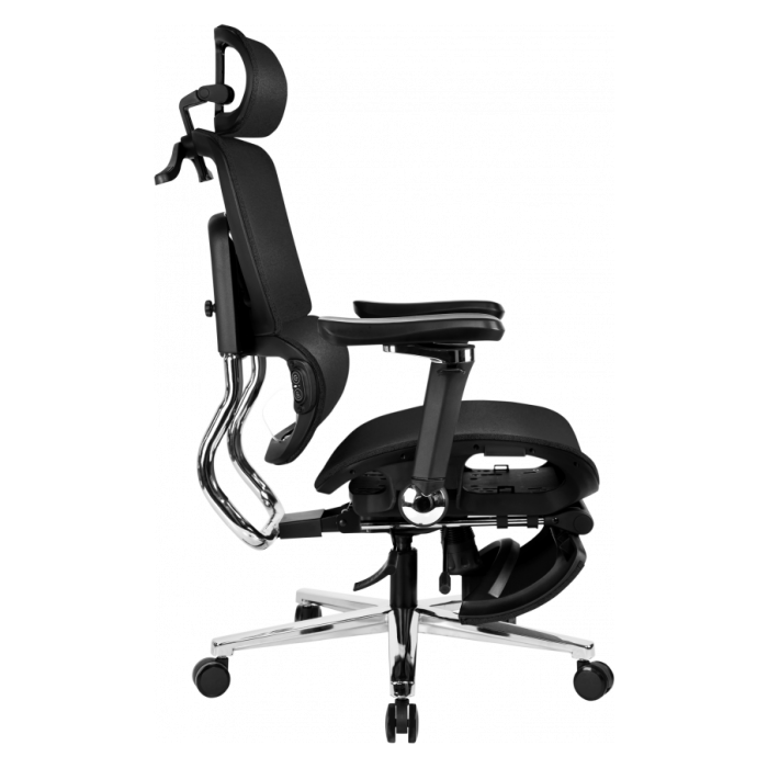 Сиденье и спинка разработаны с учётом анатомии человека, благодаря чему поддерживается правильное и естественное положение тела. Комфортная мягкая посадка равномерно поддерживает бедра, а двухсекционная спинка - правильную осанку. Поясничная поддержка оснащена функцией массажа. Регулируемые подлокотники помогают удобно расположить руки, а подголовник легко настраивается под рост пользователя, снижая нагрузку на шею и плечи. Выдвижная подножка позволяет расслабить ноги во время отдыха.