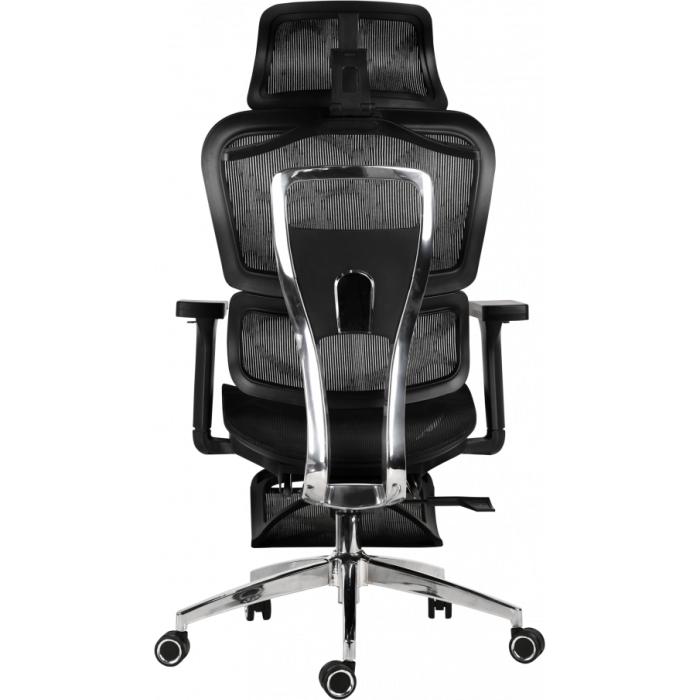 Спинка кресла состоит из двух частей: основной и нижней со специальным изгибом для поддержки поясницы. Она также оснащена механизмом регулировки высоты и наклона в диапазоне от 90° до 135° для индивидуальной поддержки позвоночника. Пользователь может настроить положение спинки для работы или короткого отдыха.