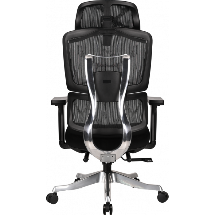 Спинка кресла состоит из двух частей и имеет возможность наклона в диапазоне от 90° до 135°, что позволяет менять положение тела в зависимости от активности. Нижняя часть предназначена для поддержки поясничной зоны. Спинка также регулируется по высоте для пользователей разного роста. Все эти регулировки позволяют перейти от удобной рабочей посадки к более расслабленному положению.