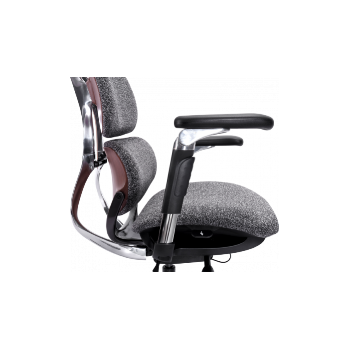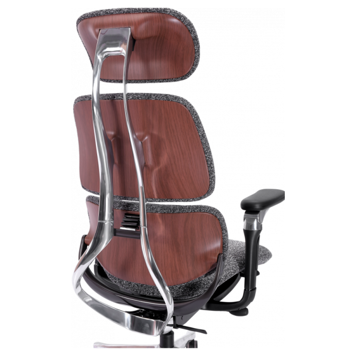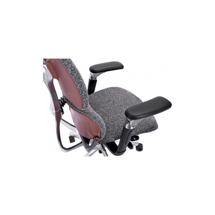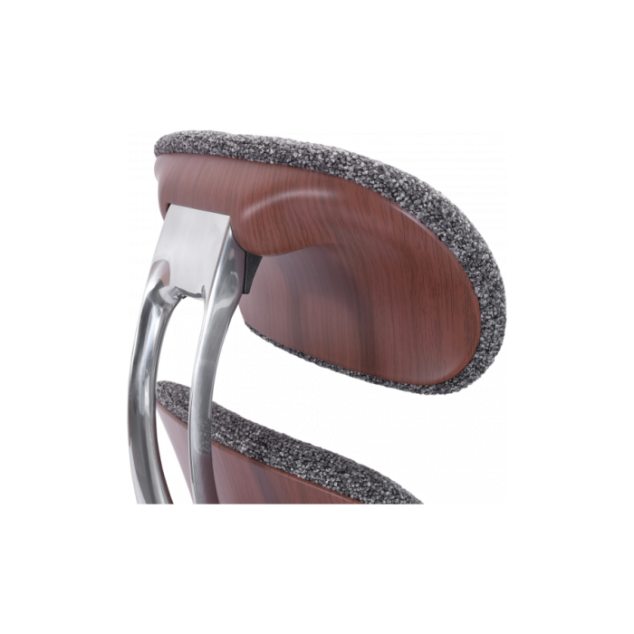 Модель представлена в тканевой обивке в сером оттенке с декоративными деревянными вставками в натуральном теплом тоне. Металлическая основа имеет матовое покрытие. Дерево выступает в роли декоративной ноты, которая визуально смягчает строгий стиль и добавляет статусности.